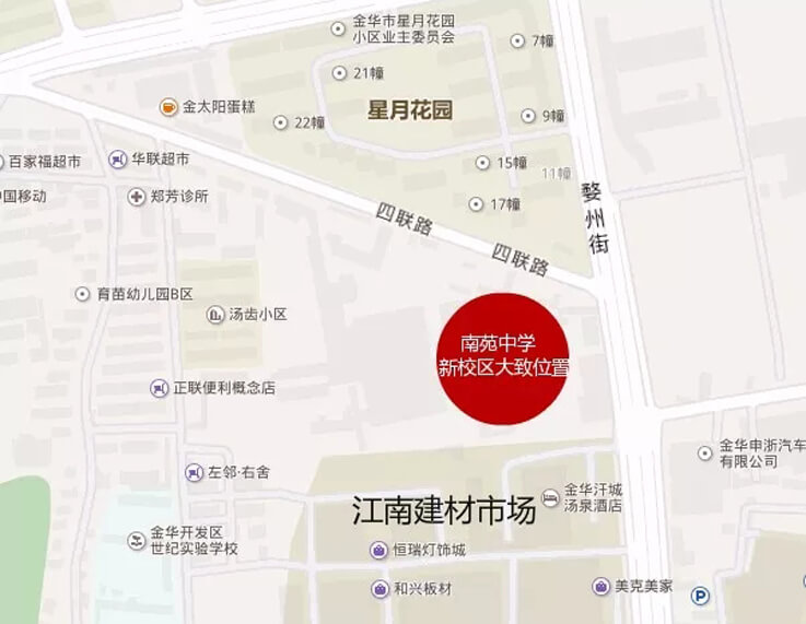 南苑中學(xué)新校區將選址在開(kāi)發(fā)區婺州街和四聯(lián)路交匯處,江南建材市場(chǎng)以北。